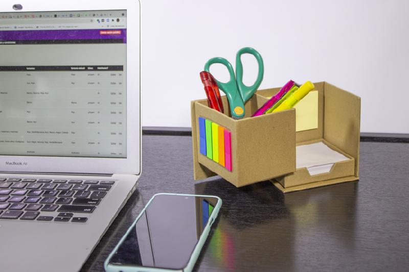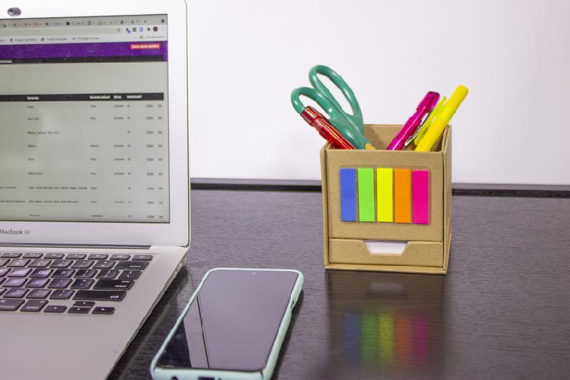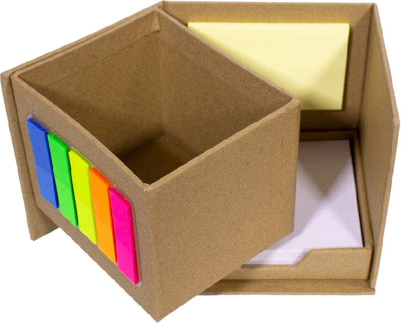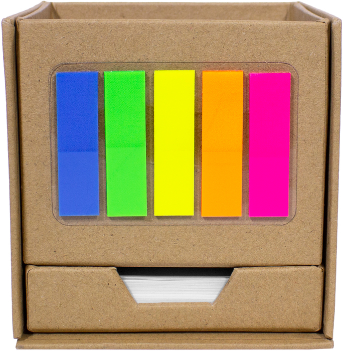 PORTA LÁPICES ECOLÓGICO ¨MALIBÚ¨ Porta Lápiz con post-it de tiras de diferentes colores flúo en el frente. Empujando hacia adelante, encuentras bloc rectangular con autoadhesivos de color amarillo y en la parte inferior un contenedor con hojas blancas de 7,4 x 8,7 cm. Producto Reciclable.