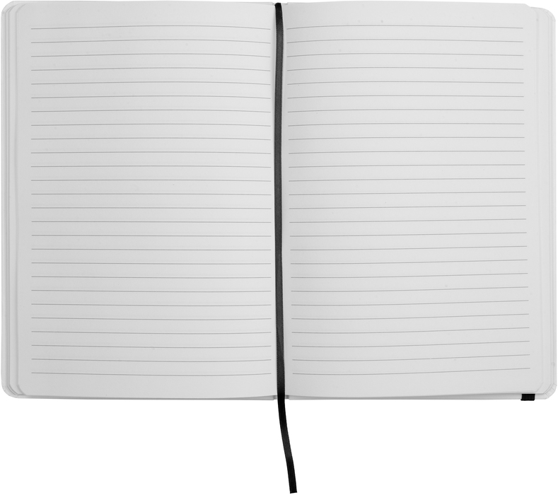 LIBRETA MEDIANA “WHITE” Libreta de pasta dura color blanco. Contiene 80 hojas rayadas, separador de tela. Cierra con banda elástica de color.