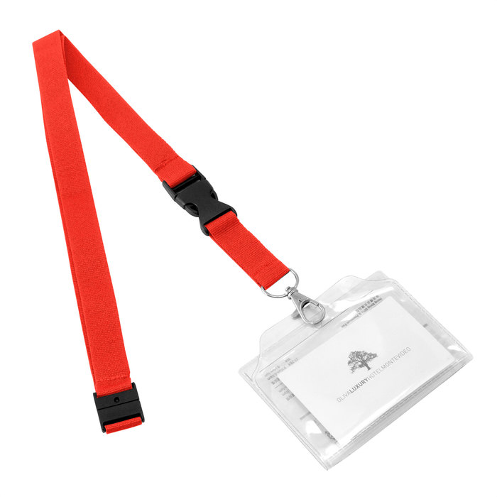 MATERIAL: Poliester + PP + metal. Porta gafete MEDIDAS: 57 cm de largo x 2 cm de ancho IMPRESION: Serigrafía Tampografía