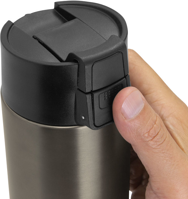 BOTELLA TÉRMICA "ALLY" Botella doble pared, sellada al vacío. Interior de acero 304 y exterior de acero 201. Pintura acabado mate. Tapa en PP con traba de seguridad y botón pulsador de apertura. Mantiene por más de 12 hs la temperatura de las bebidas calientes y 24 hs de las bebidas frías. Presentación en caja de regalo kraft.
