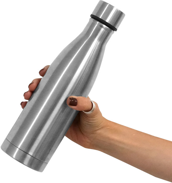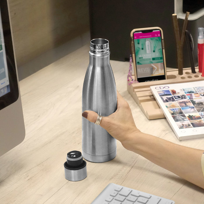 BOTELLA TÉRMICA "ISLA" Botella doble pared, sellada al vacío. Interior de acero 304 y exterior de acero 201. Cuerpo y tapa a rosca del mismo color. Mantiene hasta 12 hs la temperatura de las bebidas calientes y 24 hs de las bebidas frías. Presentación en caja de regalo.