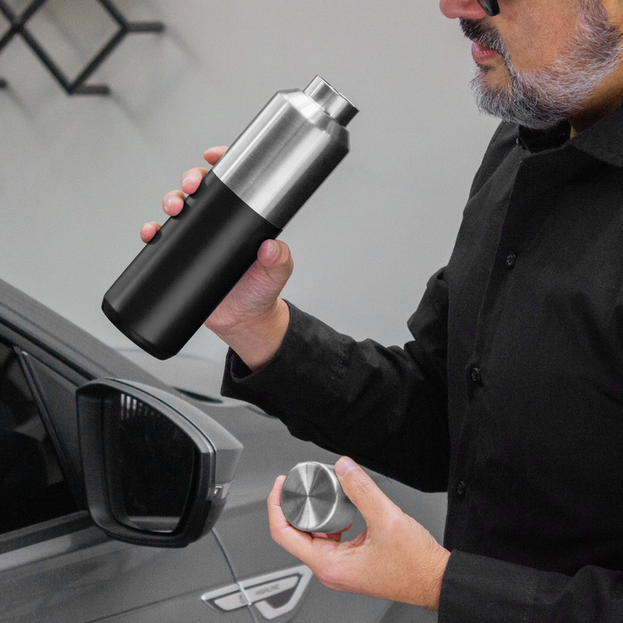 Botella térmica "DASH" Botella doble pared, sellada al vacío. Interior de acero 304 y exterior de acero 201. Tapa a rosca de acero 201 con anillo de silicona. Pintura acabado mate en parte inferior. Mantiene por más de 12 hs la temperatura de las bebidas calientes y 24 hs de las bebidas frías.