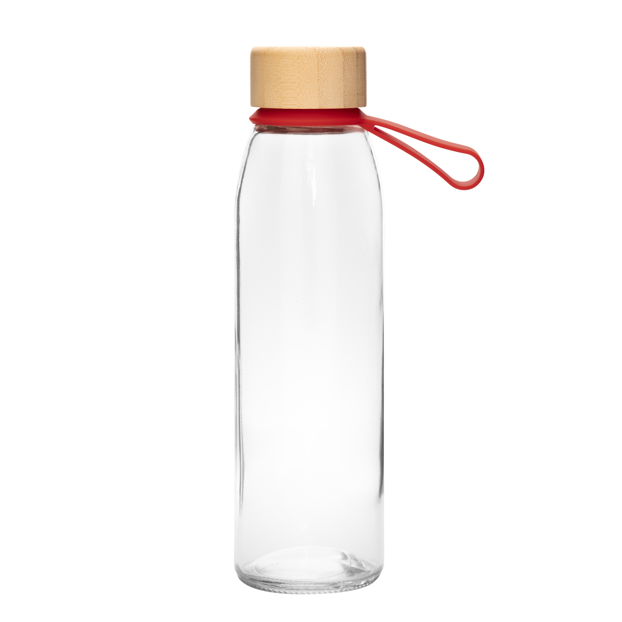 Botella "ESCARF" Botella de vidrio. Tapa de bambú, polipropileno y anillo de silicona antiderrame. Correa de silicona de diferentes colores