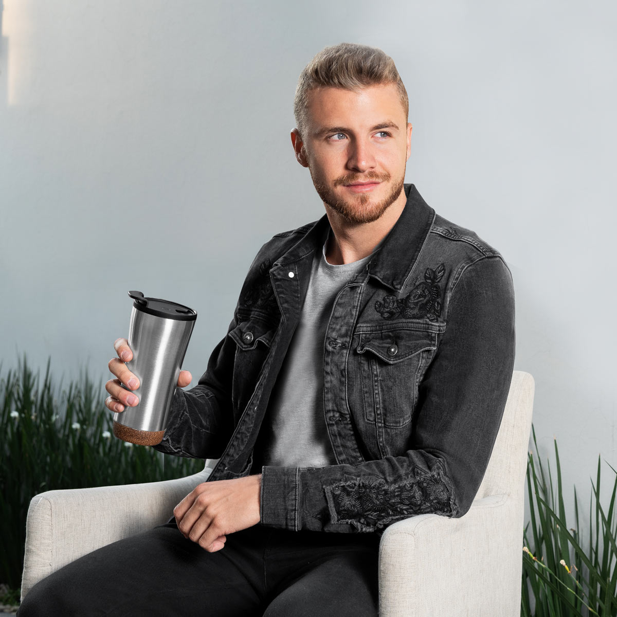 TERMO BURGO - Doble pared. Pared interna plástico, pared externa acero inoxidable. Base de corcho. Tapa en dos posiciones. No usar en microondas ni lavavajillas. Incluye caja individual.