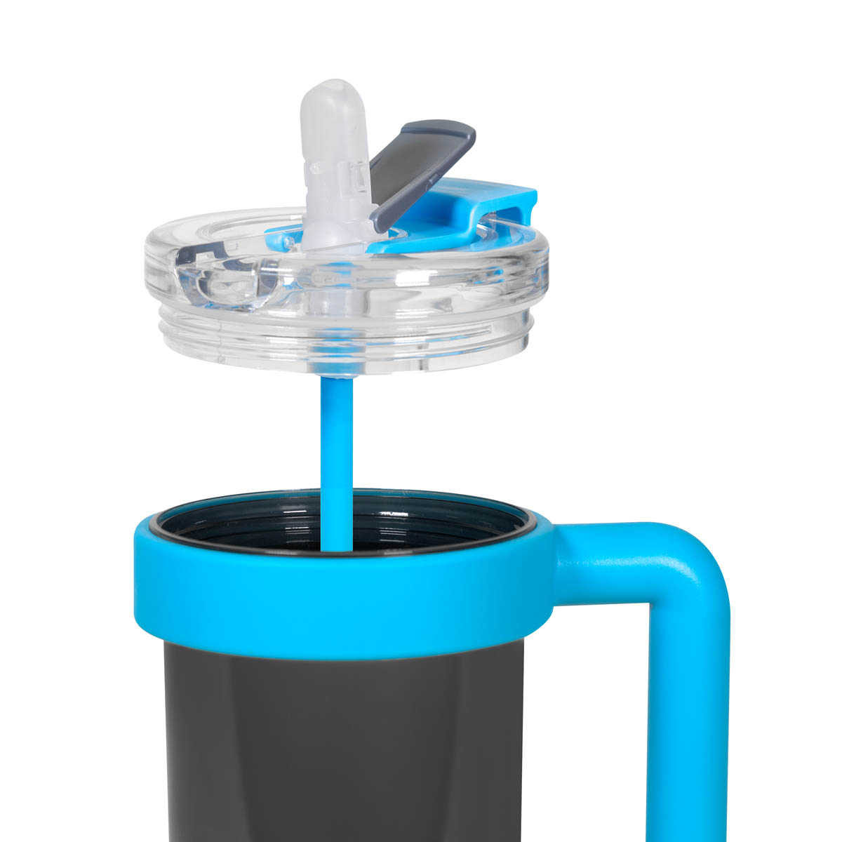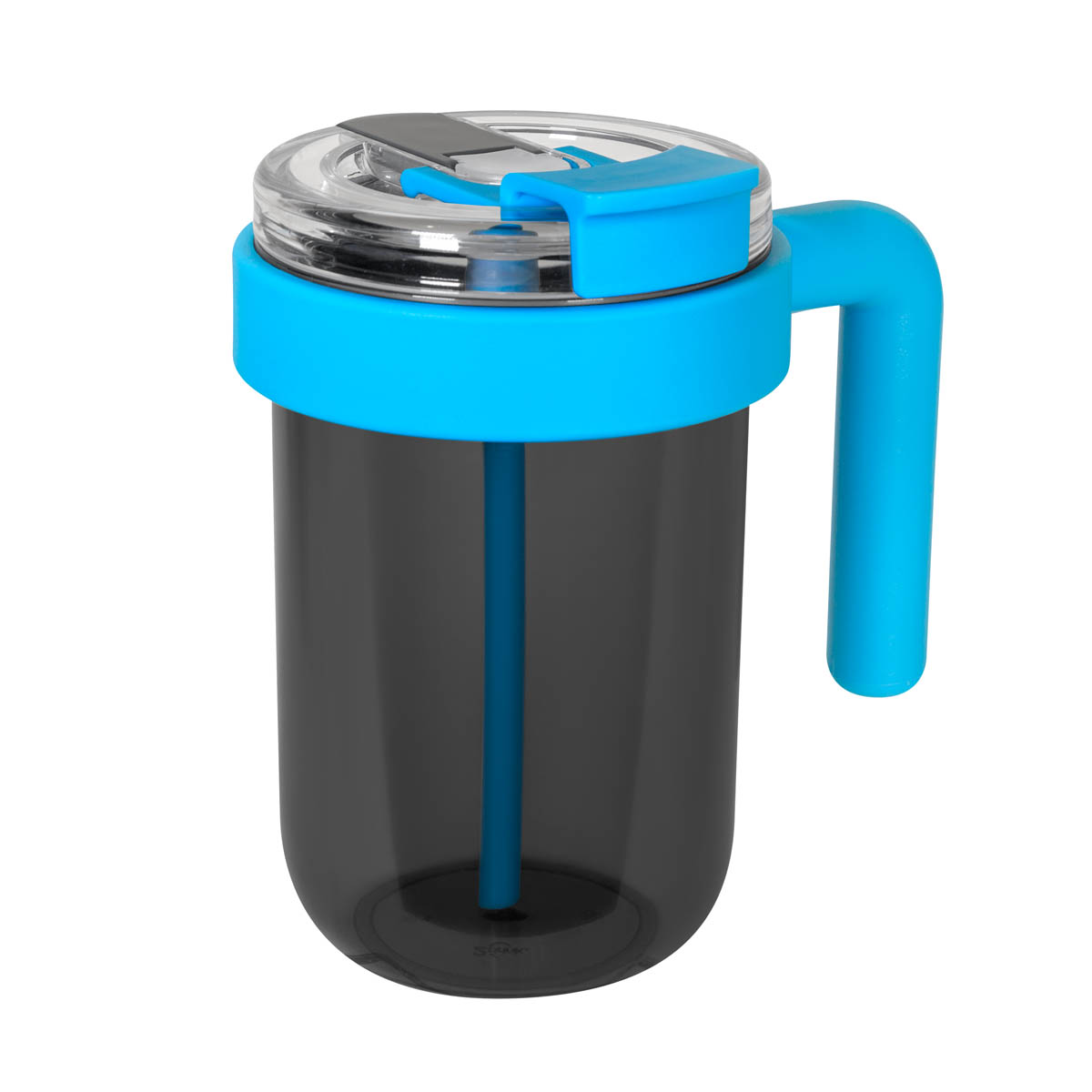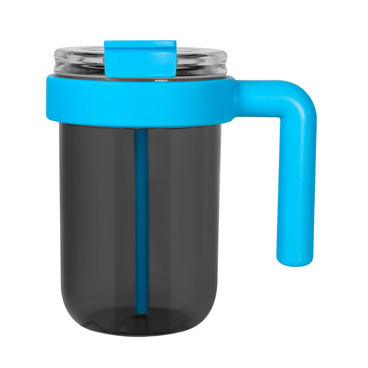 TERMO JUMM - Termo de plástico de una pared. Tapa de plástico con sistema de rosca, sobre tapa con sistema de push y boquilla plegable con popote integrado. Es fácil de usar y perfecto para llevar en cualquier actividad. Su asa grande y ergonómica, permite un agarre más cómodo. Su combinación de colores, con un cuerpo oscuro translúcido y acentos en color sólido en el asa, popote y tapa, le da un toque moderno y atractivo. Incluye caja individual.
