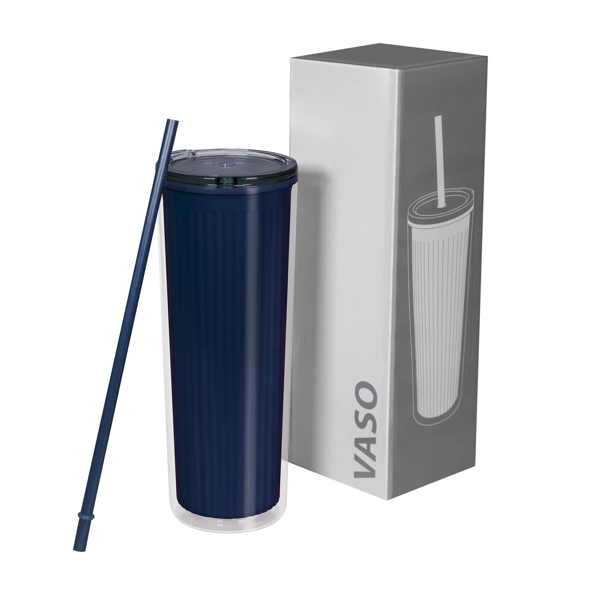VASO NELI - Termo de plástico doble pared. Pared interna de color, texturizada a rayas, y pared externa lisa y transparente que, en conjunto, ofrecen un diseño moderno y vibrante. Incluye tapa de plástico con sistema push y popote a juego. Capacidad de 22 Oz. Base de 7.5 cm de diámetro. Incluye caja individual.