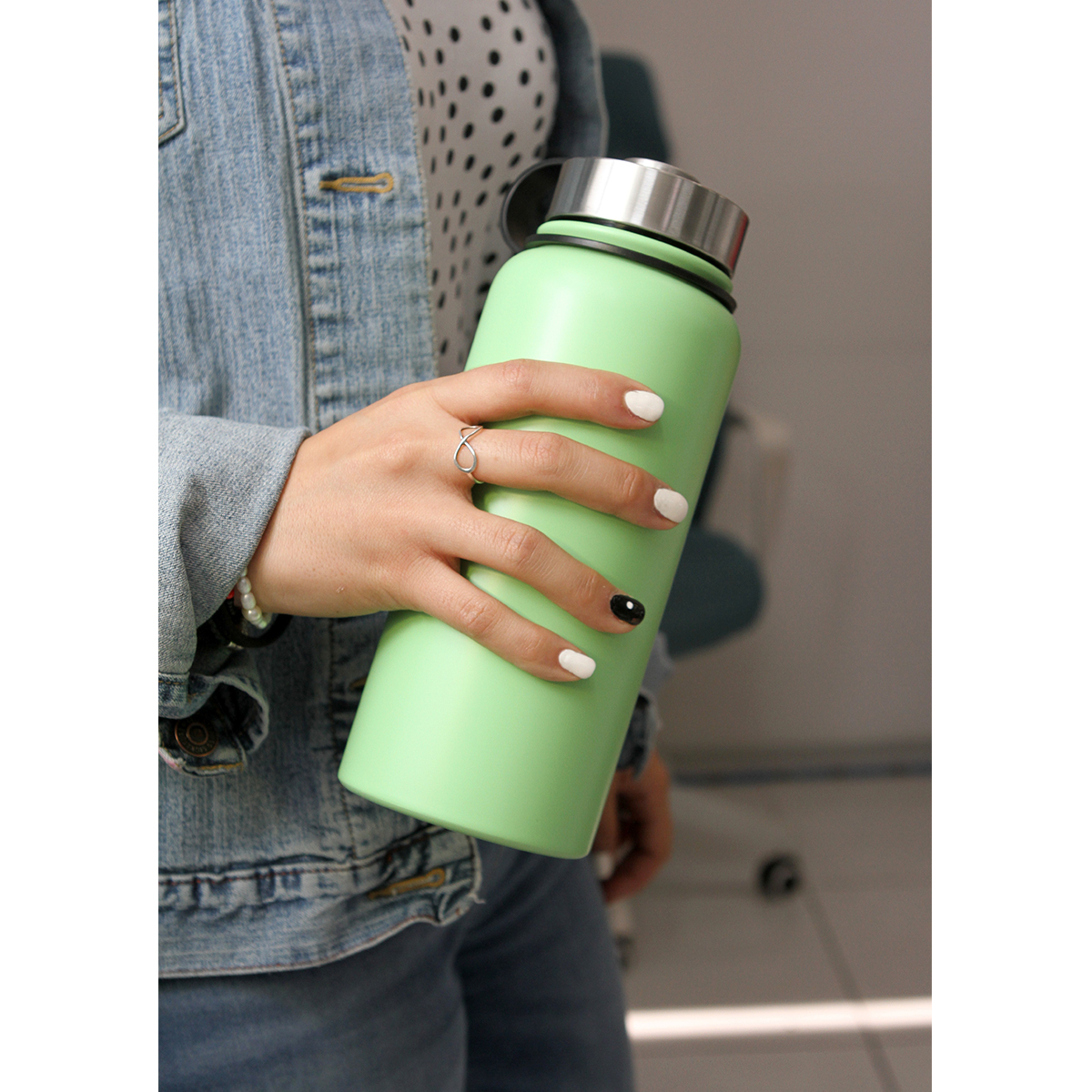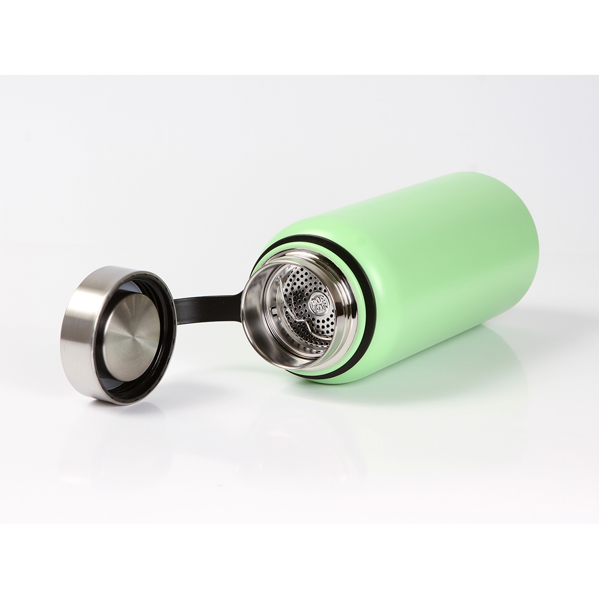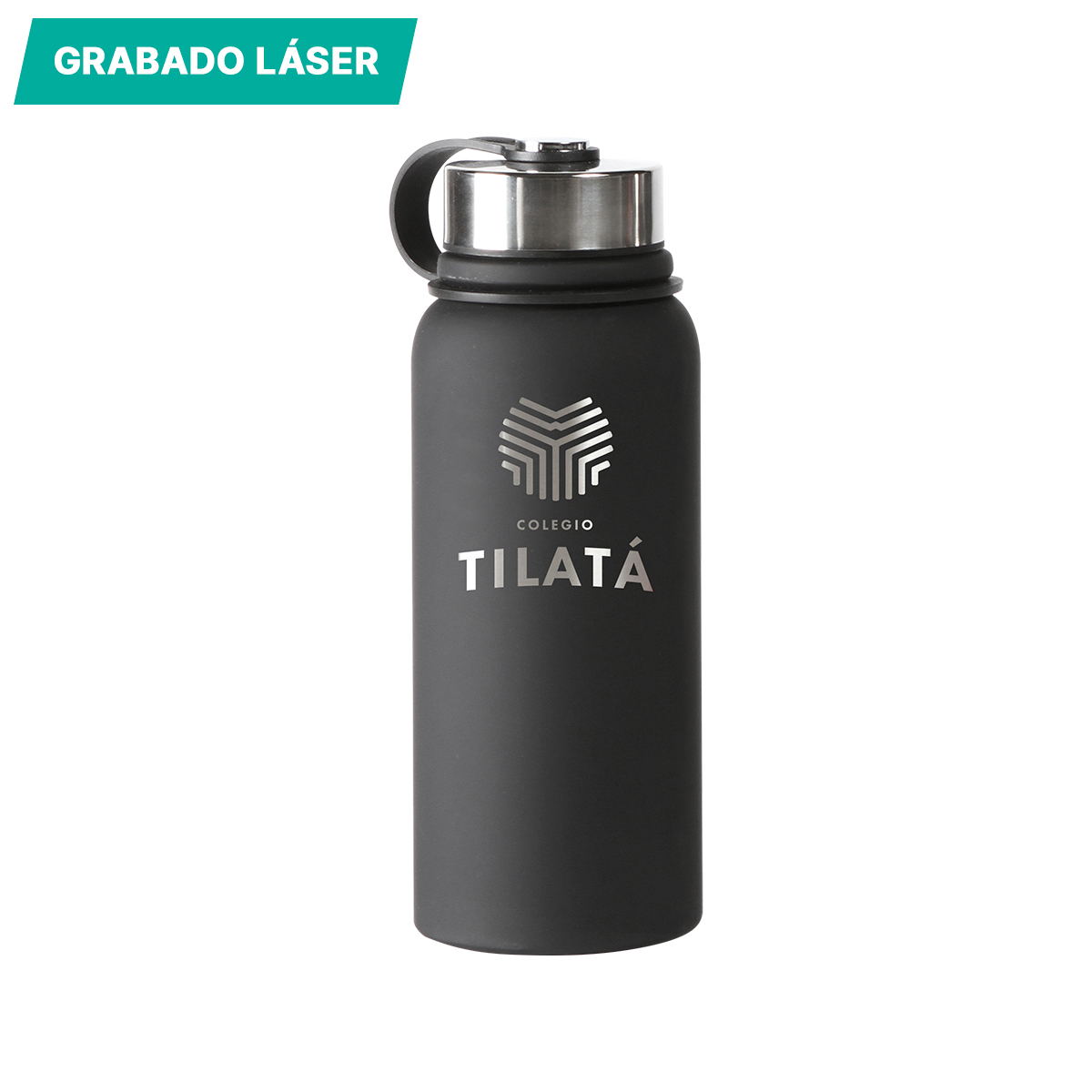 Termo Ceuta. - Termo de acero inoxidable doble pared con acabado mate, incluye rejilla metálica para té, agarradera de silicón, fabricado en materiales de grado alimenticio, mantiene bebidas frías o calientes por un largo tiempo, no usar en microondas. Capacidad de 800 ml (27 oz). Incluye caja de cartón individual.