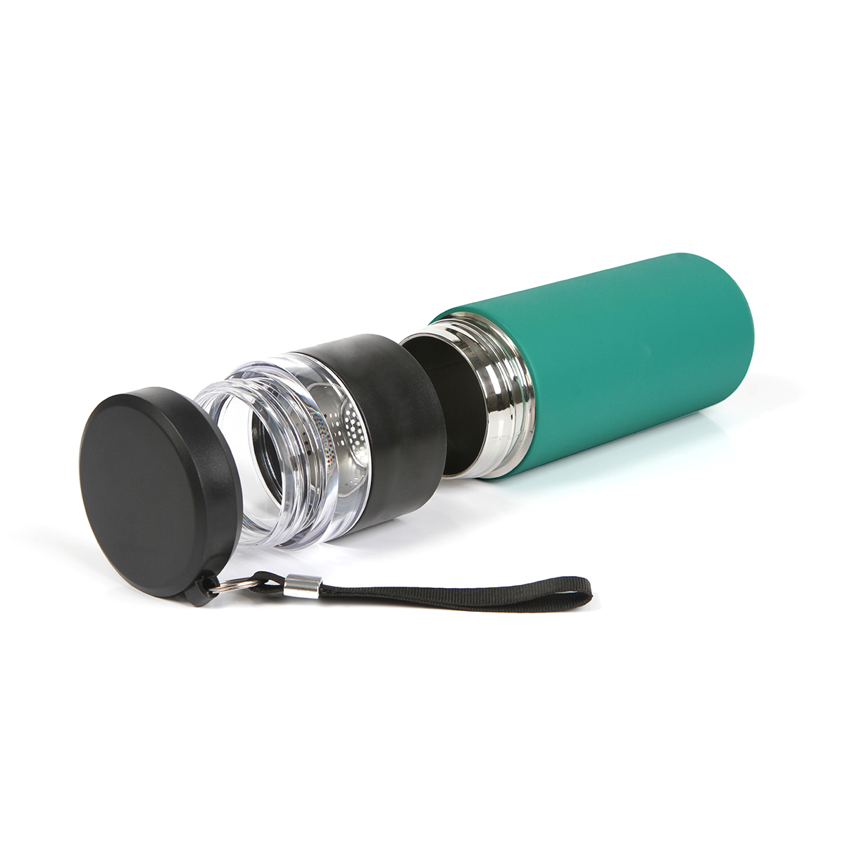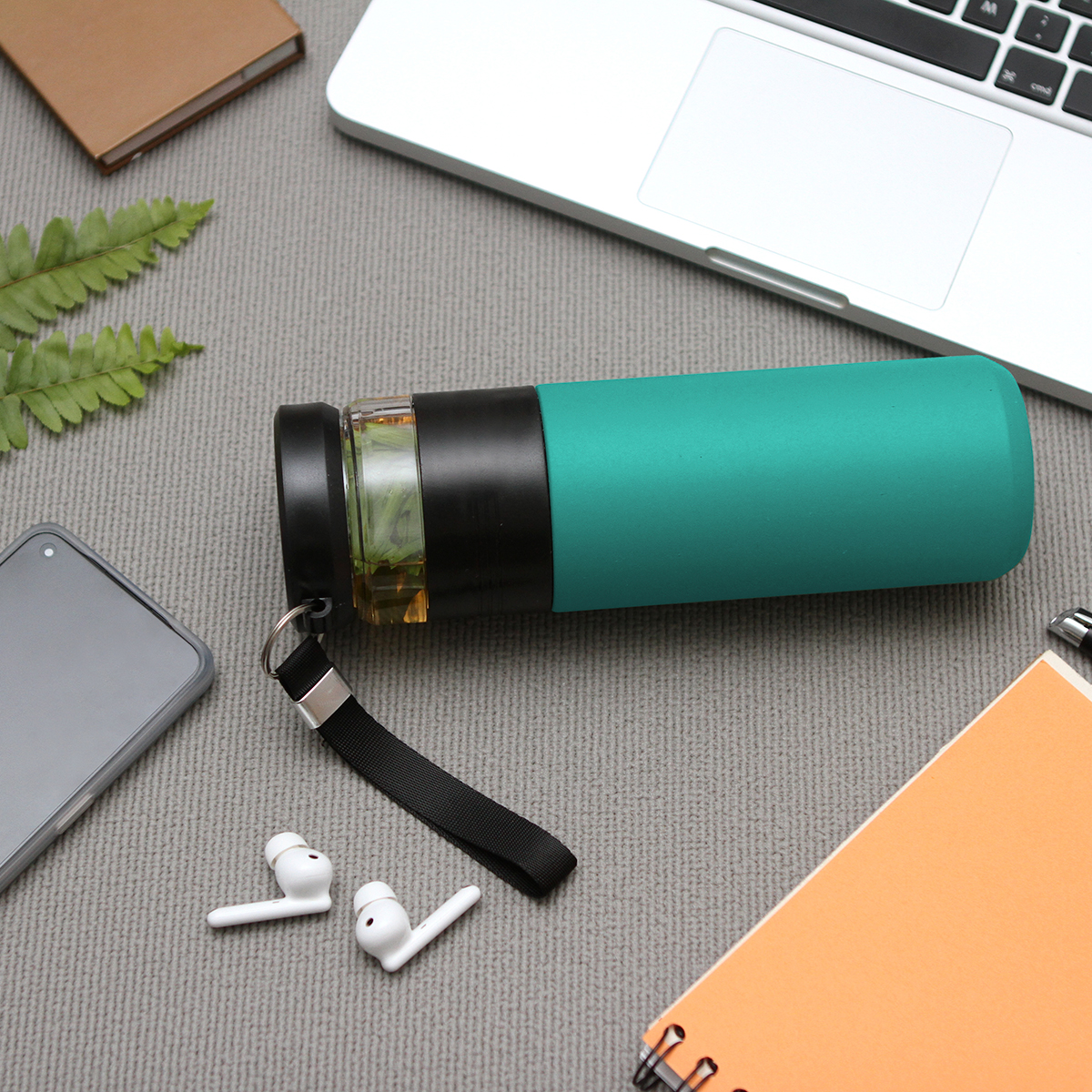 Termo Gallico. - Termo de acero inoxidable doble pared, con infusor de vidrio para separar el té o café del agua, rejilla coladora y correa de poliéster. Fabricado en materiales de grado alimenticio, mantiene bebidas frías o calientes por un largo tiempo. No usar en microondas. Capacidad de 500 ml. Incluye caja de cartón individual.