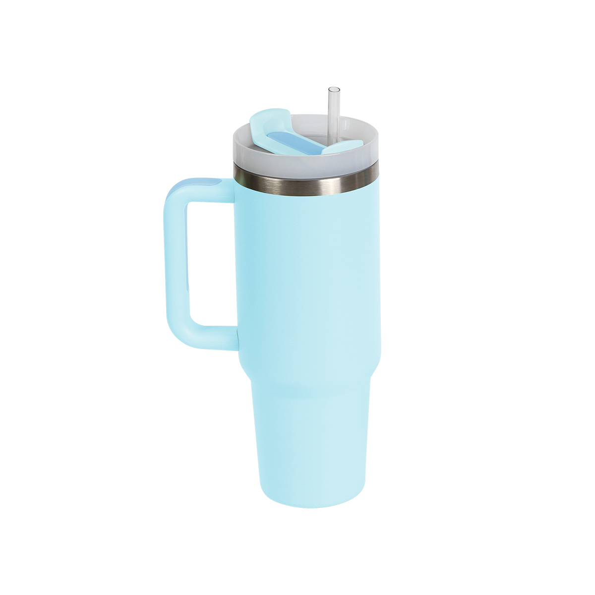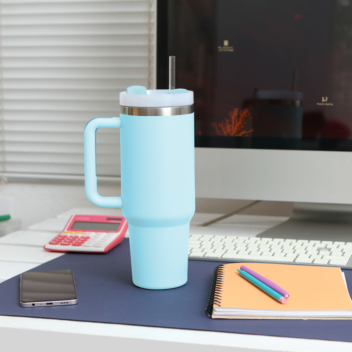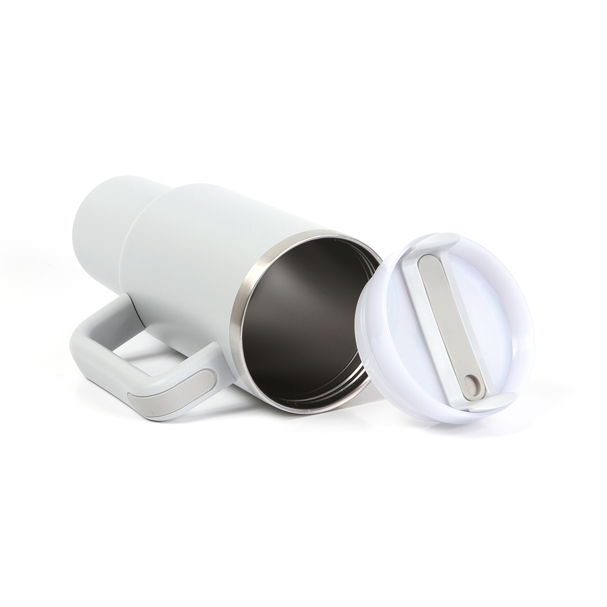 Termo Caleri. - Termo Jumbo fabricado en acero inoxidable de doble pared con asa y tapa deslizable con opción para usar con o sin popote. Cubierta giratoria con tres posiciones:  apertura especial para popote que mantiene el popote reutilizable en su lugar, apertura de bebida para tomar directamente del termo y cubierta completa para cerrar el termo.  Capacidad de 1,200 ml (40 oz). Incluye caja individual.