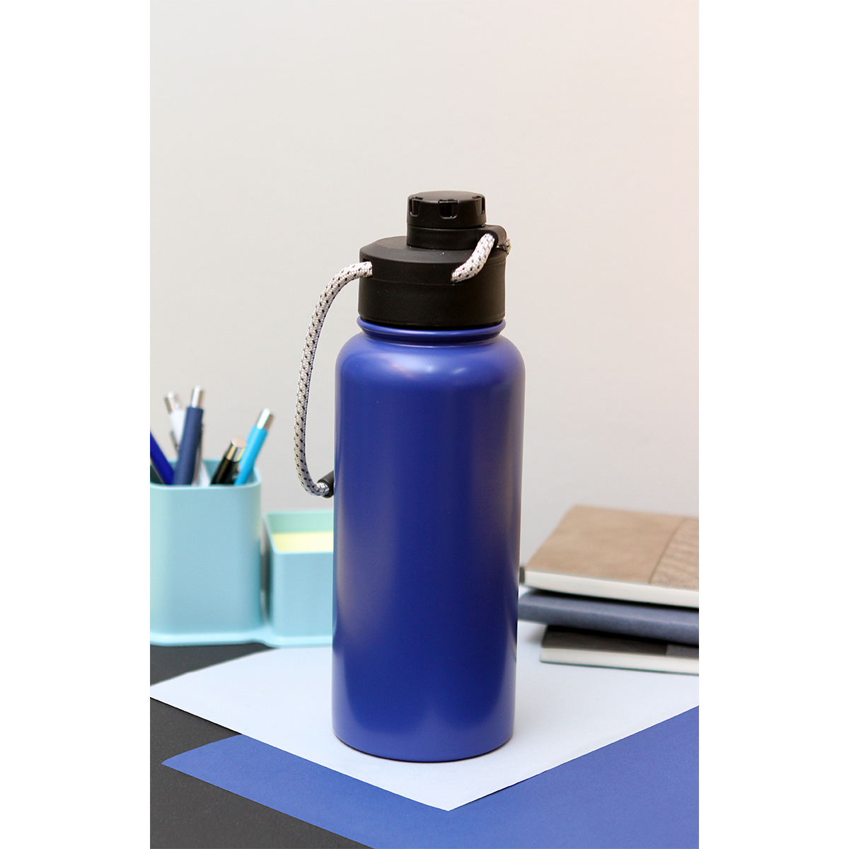 Termo Aneby. - Termo fabricado en acero inoxidable 304 y 201. Incluye tapa de rosca fabricada en polipropileno con cordón adecuado para cargar y boquilla para tomar. Capacidad de 1 litro.