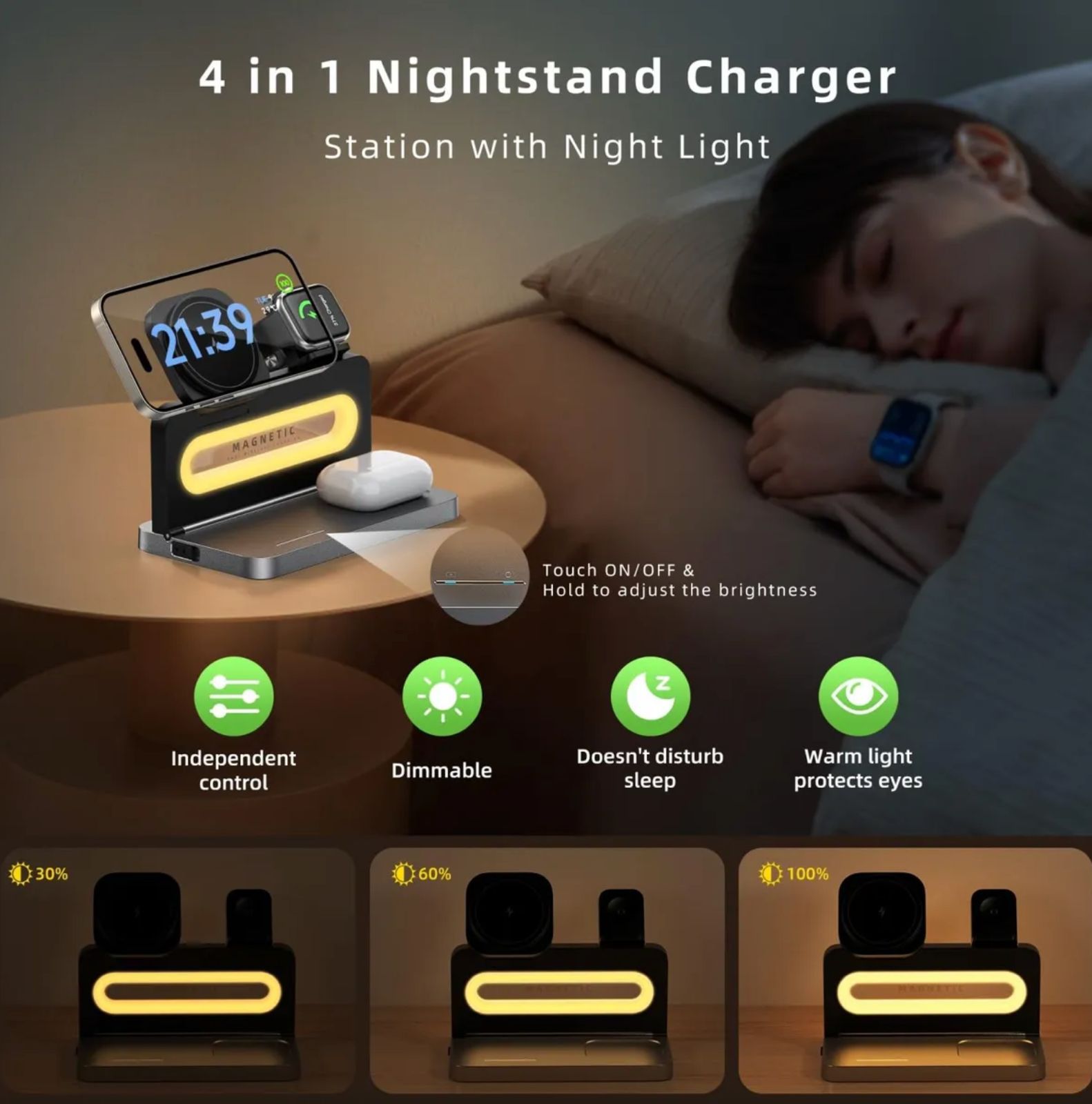 CARGADOR MAGNÉTICO 3 EN 1 Base de carga inalámbrica portátil 3 en 1 (smartphone, smartwatch y auriculares). Cuenta con iluminación LED. Incluye cable USB tipo C