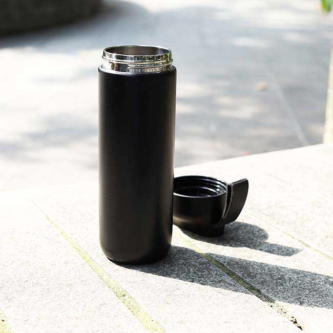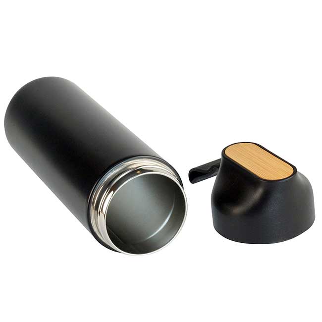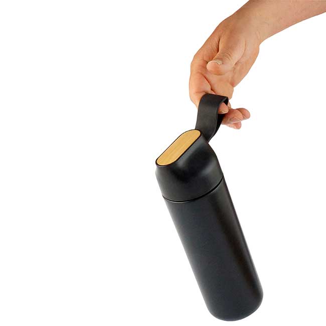 Termo Roble Capacidad: 600 ml. Sistema de doble pared al vacío. Correa de silicón para sujetar. Detalle de lámina de bamboo en tapa. Color: Negro