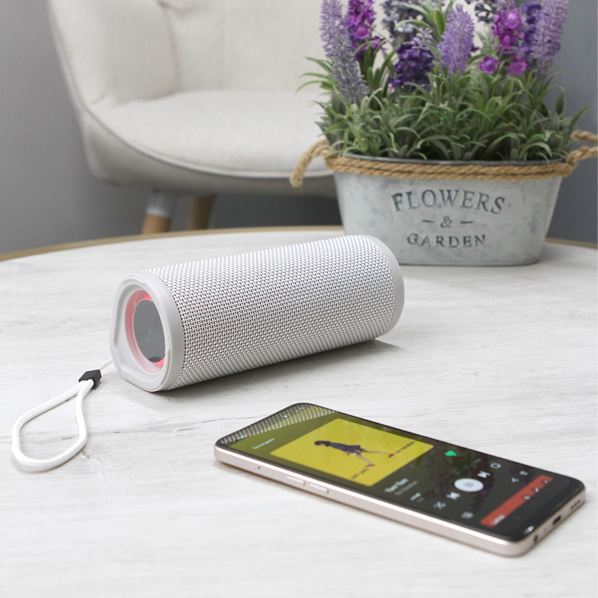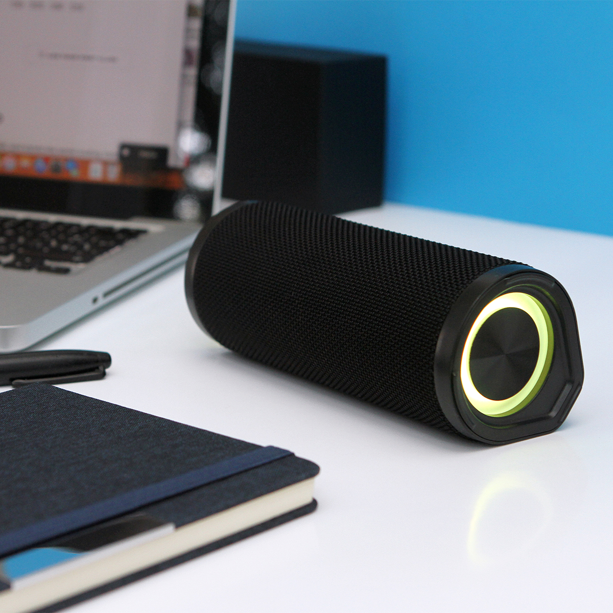 Bocina Piana. - Bocina con conexión de sonido sin cables, cilindrica con radio FM y entrada para tarjeta TF, fabricada en ABS, silicón y tela. Con iluminación en los laterales, fabricada en ABS, silicón y tela. Cable USB incluido. Incluye caja de cartón individual.