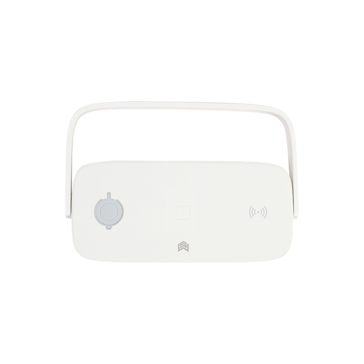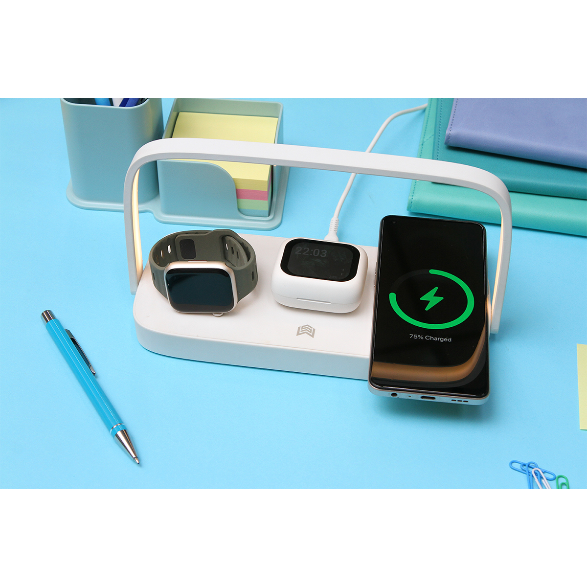 Cargador Fogliano. - Cargador inalámbrico fabricado en ABS y plástico de policarbonato (PC), compatible con celular, reloj, y audífonos. Potencia de carga de 5w/7,5w/10w/15w para celular, 2,5w para reloj inteligente y 3W para audífonos inalámbricos. Incluye manija y función de luz nocturna.