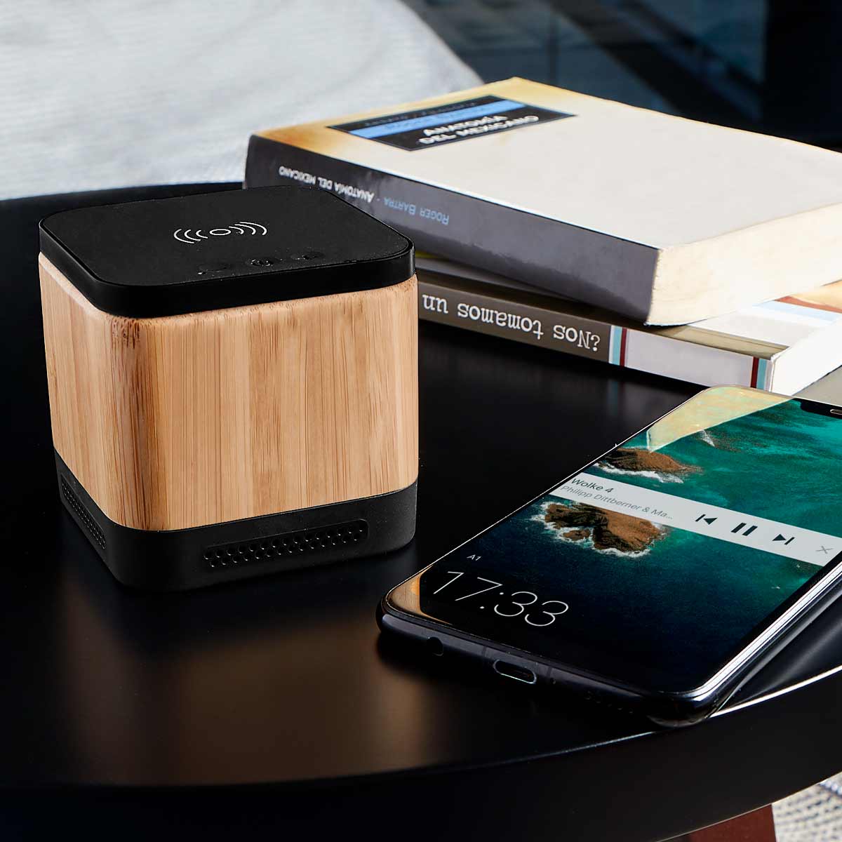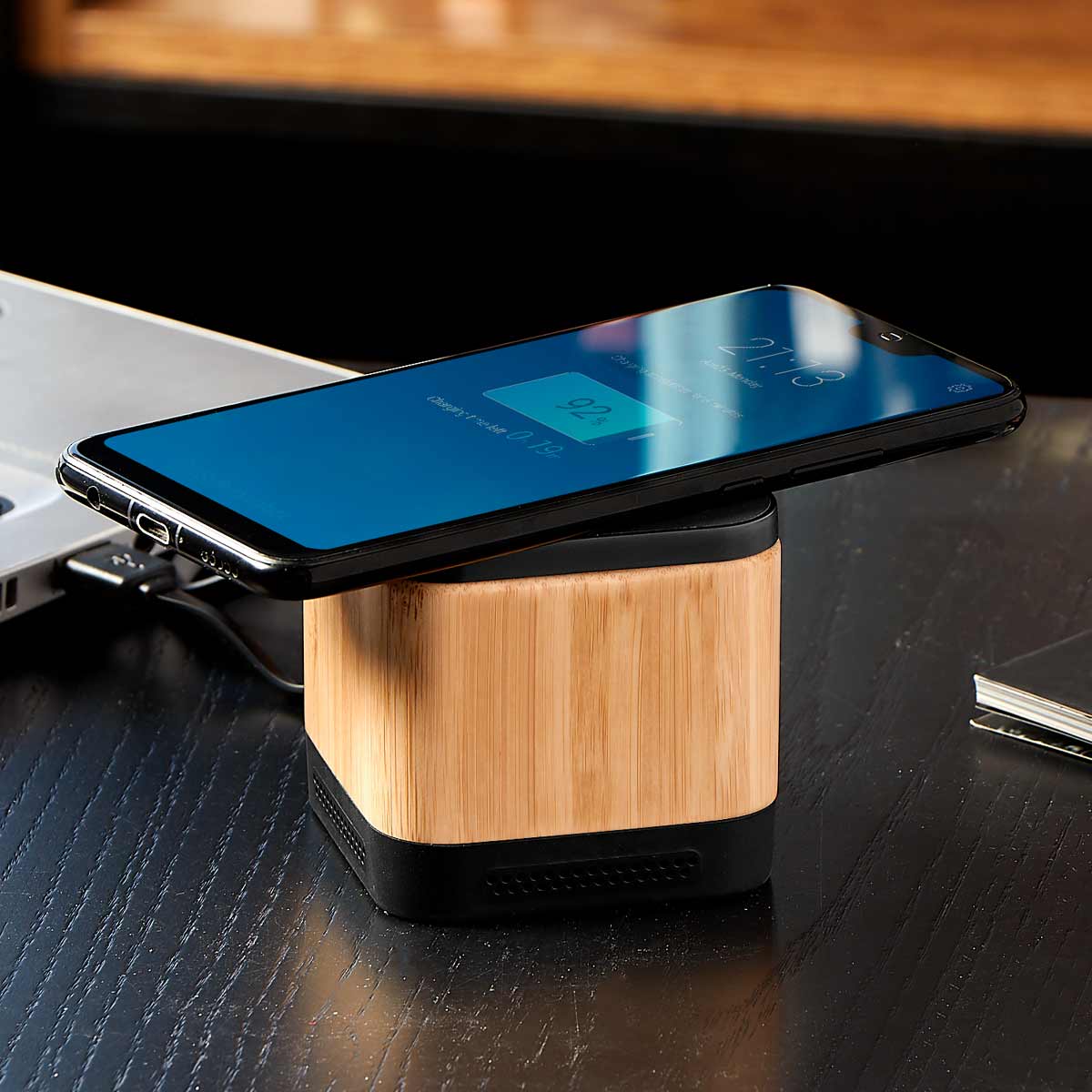 BOCINA RIOJA - Bocina bluetooth con batería recargable. Reproducción de música de 2 hrs aproximadamente. Controles integrados de llamadas, volumen y reproducción de audio. Rango de conexión de 10 metros. La base al estar conectada, funciona como cargador inalámbrico de smartphone. Incluye cable cargador USB.
