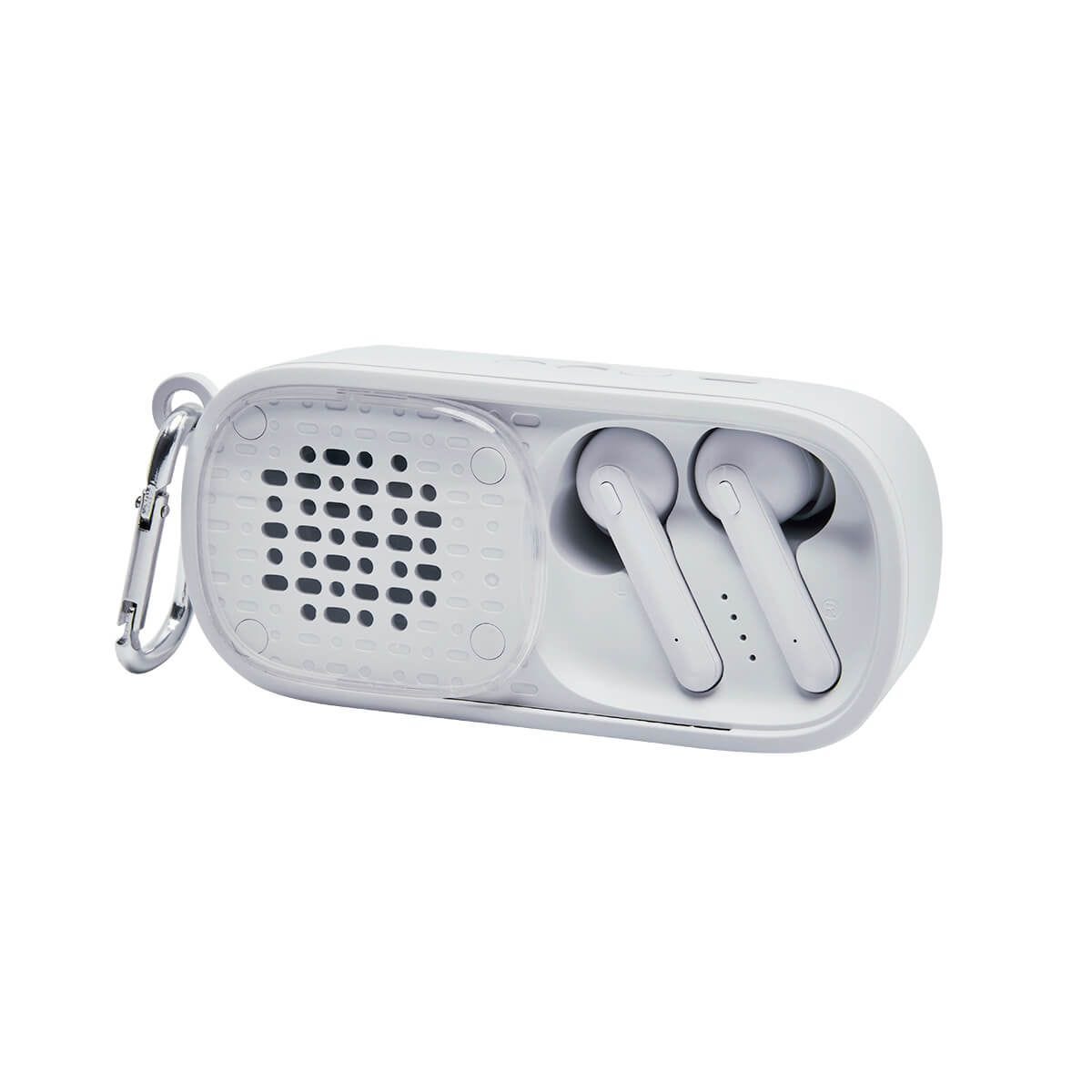 BOCINA CON AUDÍFONOS RIDE - Bocina y audífonos bluetooth con batería recargable. Reproducción de música de 3 hrs aproximadamente. Rango de conexión de 10 metros. Gancho para transportar fácilmente. Incluye cable cargador USB.