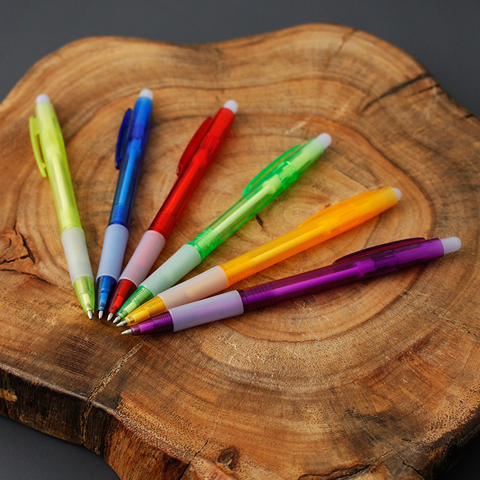 Jello Bio tinta Negra. Bolígrafo de plástico en colores translúcidos. Cuenta con un grip para mayor comodidad en la escritura. Mecanismo retráctil. Tinta Negra, con excepción del bolígrafo Jello azul, con tinta de escritura Azul.
