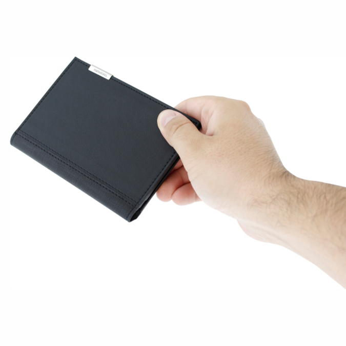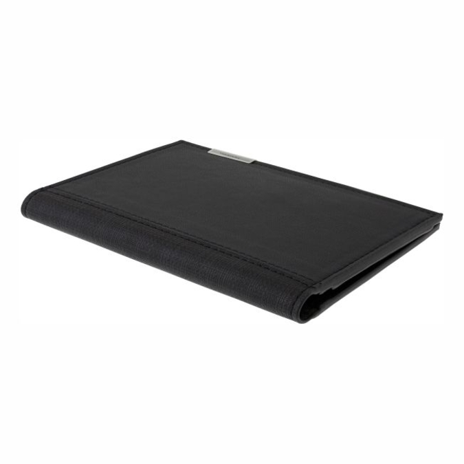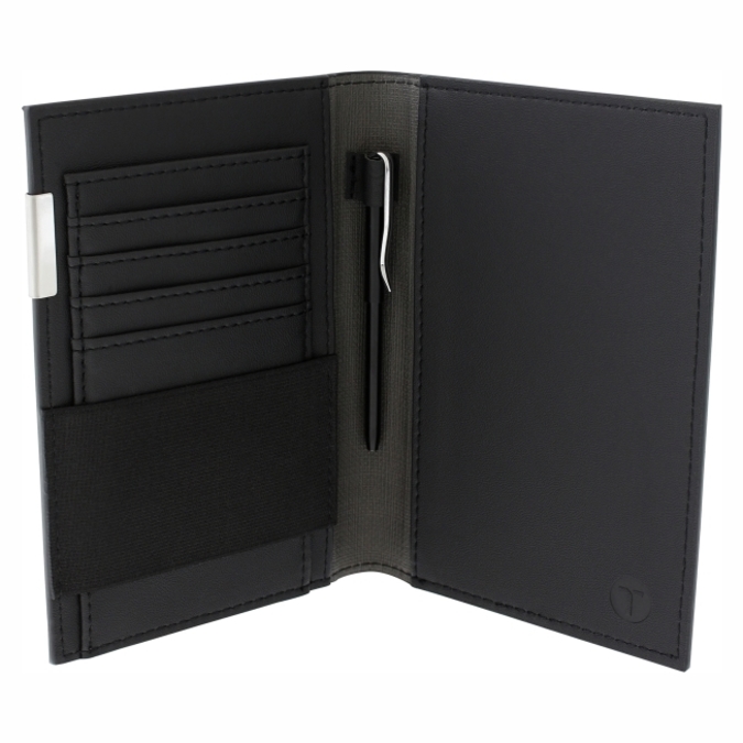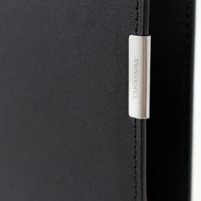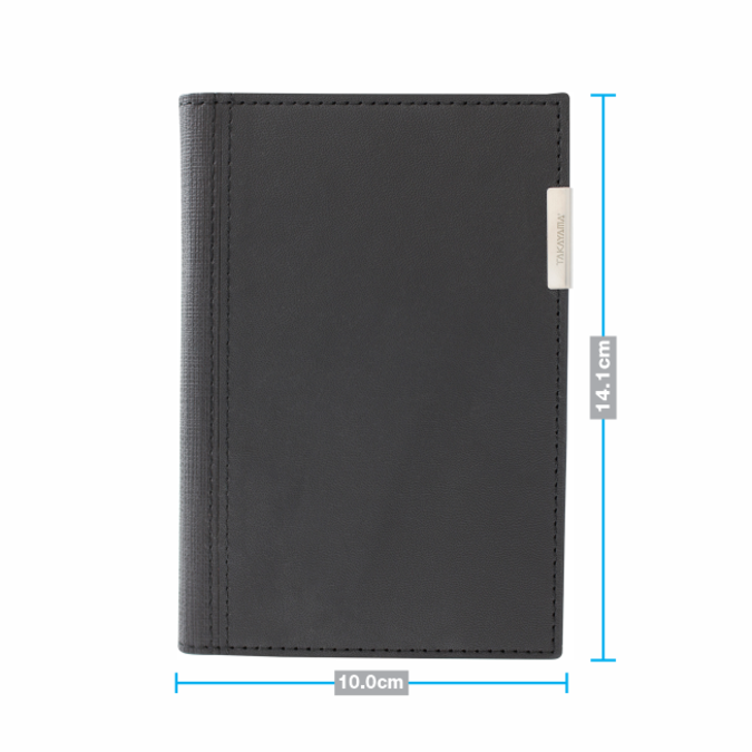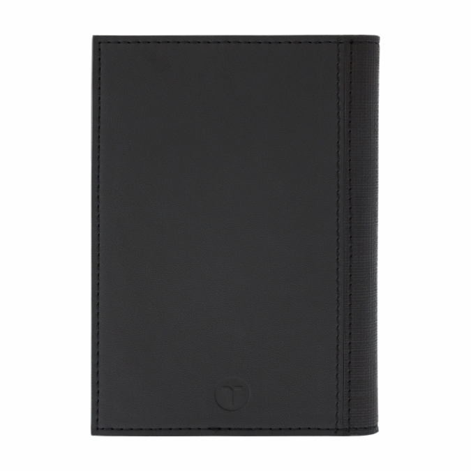 Porta pasaporte Takayama Chisaii Porta pasaporte tipo billetera marca TAKAYAMA. Combinación de 2 texturas en curpiel color negro. Cuenta con espacio para 5 tarjetas, y elástico multi usos. Incluye bolígrafo Minimal.