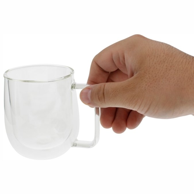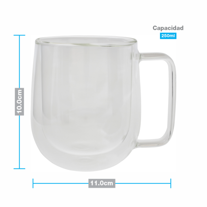 Taza Celsius Taza transparente de doble pared con asa. Diseño que permite aislar la temperatura del contenido, ya sea que se trate de bebidas frías o calientes. Apta para microondas. Capacidad: 250 ml. Lavar antes de usar.