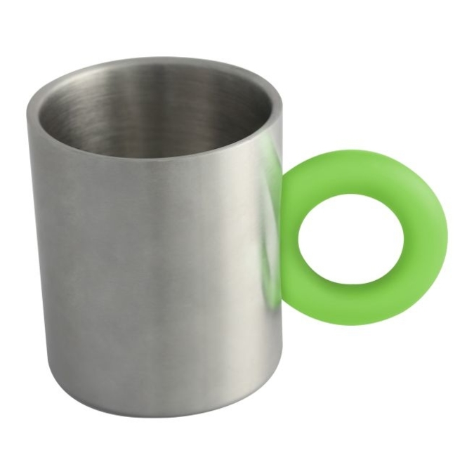 Taza Dona Divertida taza de acero inoxidable 300 ml con un inserto de plástico rígido en forma de dona que funciona como asa. A elegir entre varios colores. Se entrega en cajita de cartón individual. Lavar antes de usar.