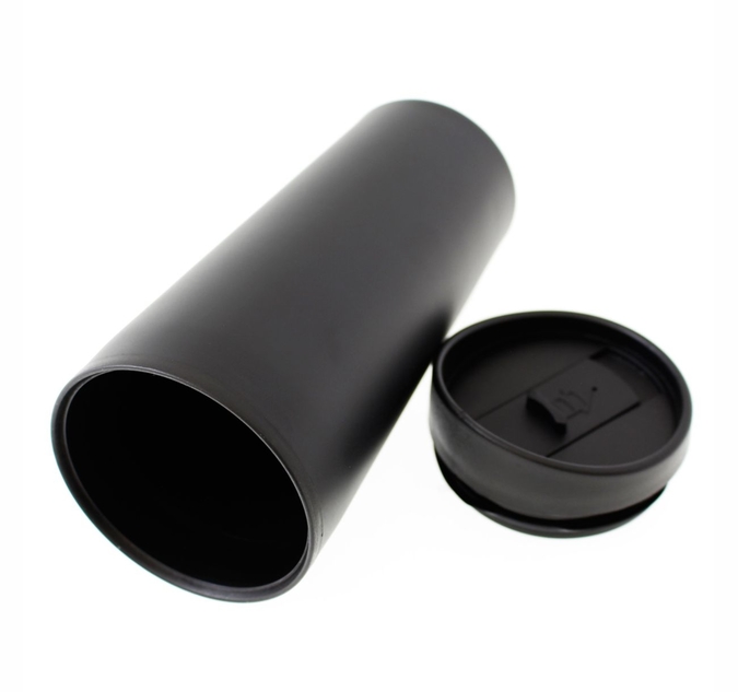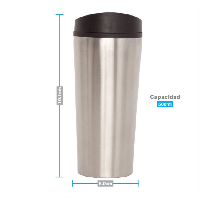 Vaso Bistro Vaso Térmico de acero Inoxidable 500 ml. Interior en plástico negro. Tapa con cierre a presión y boquilla de seguridad. Se entrega en caja de cartón individual. Lavar antes de usar.